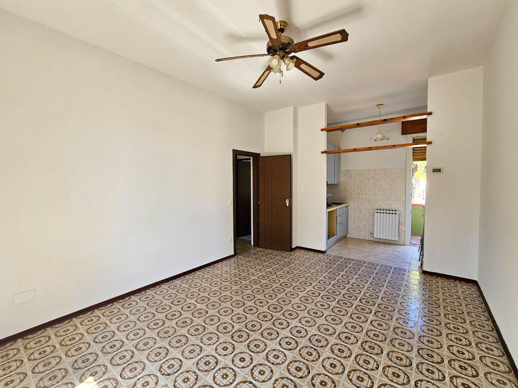 All'interno, un soggiorno con angolo cottura e un secondo balcone.