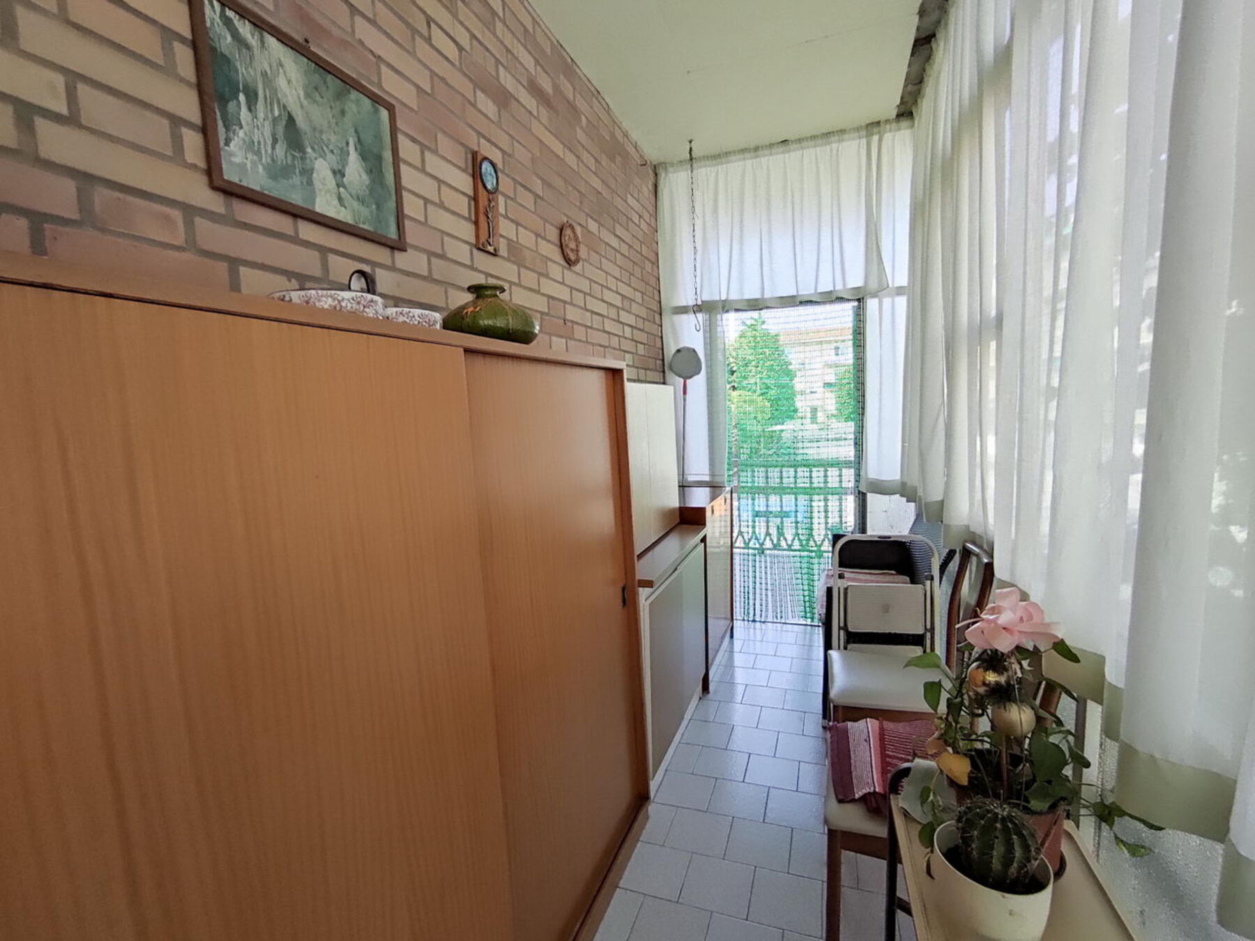 un luminoso soggiorno con angolo cottura e da cui si accede ad un terrazzo ad L, con una parte chiusa con infisso,